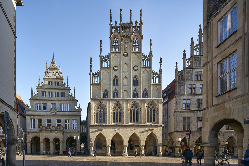 Das historische Rathaus ist ein gotischer Bau aus der Mitte des 14. Jahrhunderts. Das Gebäude zeichnet sich vor allem durch seine hohen und imposanten Giebel aus. Besondere Bekanntheit erlangte das Rathaus in Münsters Innenstadt am 15. Mai 1648, als im Friedenssaal des Rathauses der Spanisch-Niederländische Frieden beschworen wurde. Am 24. Oktober des selben Jahres wurde im Rathaus dann auch der Dreißigjährige Krieg beendet und somit der Westfälische Frieden geschlossen. Noch heute gilt das historische Rathaus als Stätte des Westfälischen Friedens. Es wurde am 15. April 2015 mit dem Europäischen Kulturerbe-Siegel ausgezeichnet.