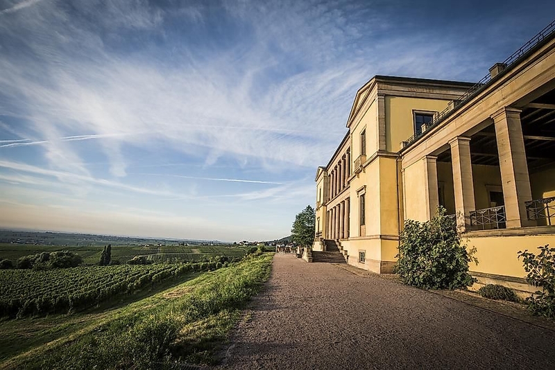 Die an antike Vorbilder erinnernde klassizistische Villa begeistert mit kostbaren Edelholzböden, reichhaltigen Decken- und Wandmalereien und einem einmaligen Blick weit über die Pfalz und die Rheinebene.